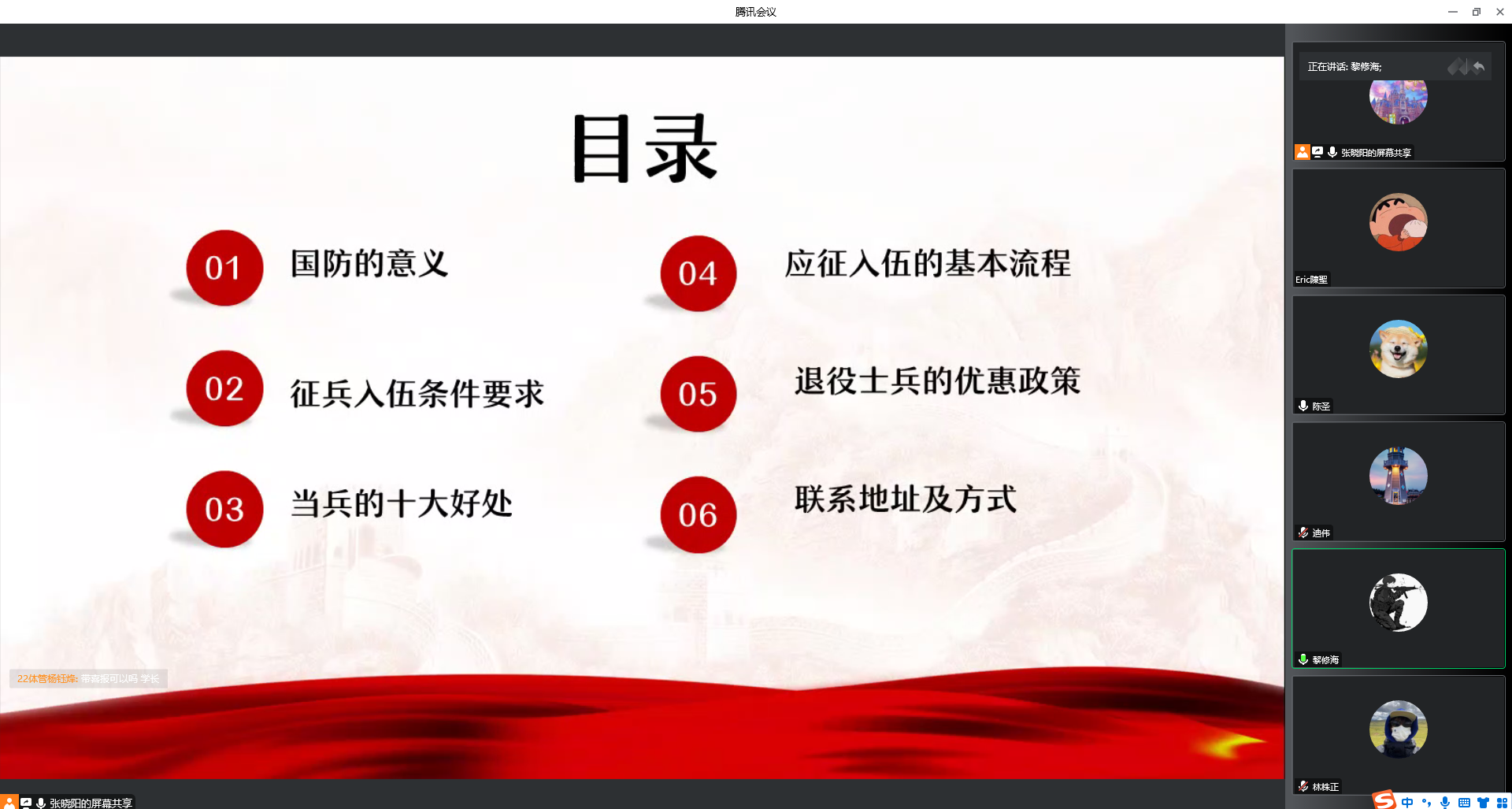 会上,张晓阳老师详细解读了征兵政策。她从征兵入伍的具体要求、优惠政策、发展机遇等方面进行了详细解读。她指出,参军入伍不仅是对国家征兵政策的积极响应,更是我国加强国防建设的重要举措,参军入伍的人员需要具备良好的身体素质、吃苦耐劳的品质和坚定的理想信念。